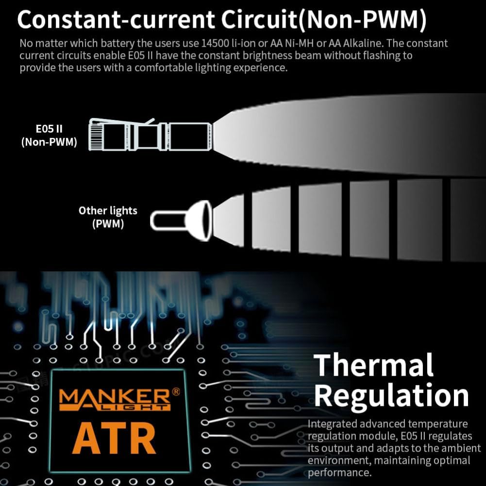 Included Components 1x Mankerlight E05 II LED flashlight, 1x Spare waterproof o-ring, 1x Type-C USB charging cable, 1x User manual, Lanyard